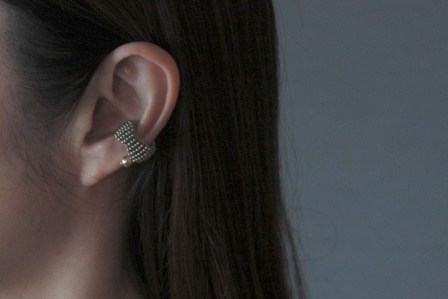 ※こちらはクリアシルバー、形はno.1(幅広型)のページです。 小さなビーズをぎゅっと寄せ合わせたイヤーカフです。 ひとつでコーディネートのアクセントになる存在感がありながらも、ビーズならではの繊細さを感じられる一点です。 耳に触れる裏地にはスウェード地を採用したことにより、柔らかい着け心地を実現しました。 また、サイズ調整が可能となっており、着ける人それぞれの耳にフィットさせることができますので、痛みを感じづらいイヤーカフとなっております。 ぜひ日々のコーディネートにご活用くださいませ。 ※なお、制作前のご相談で、円周のサイズ調整が可能でございます。耳の大きさが大きい、小さい等、ご不安な点がございましたら、一度ご相談くださいませ。 ⚪︎ご注文の前に、必ずinformationをご一読いただきますようお願いいたします。 ⚪︎繊細な作りとなっておりますので、優しく扱っていただきますようにお願いいたします。 ⚪︎受注制作となりますので、お届けまでに14日〜30日程いただいております。ご確認いただいた上でのご注文をお願いいたします。お急ぎの際はご相談くださいませ。できる限り対応させていただきます。 〈サイズ〉 モチーフ 内径約10〜12㎜ (装着時5㎜程可動可) 〈素材〉 ガラスビーズ ポリエステル糸 〈裏地〉 フェイクスエード