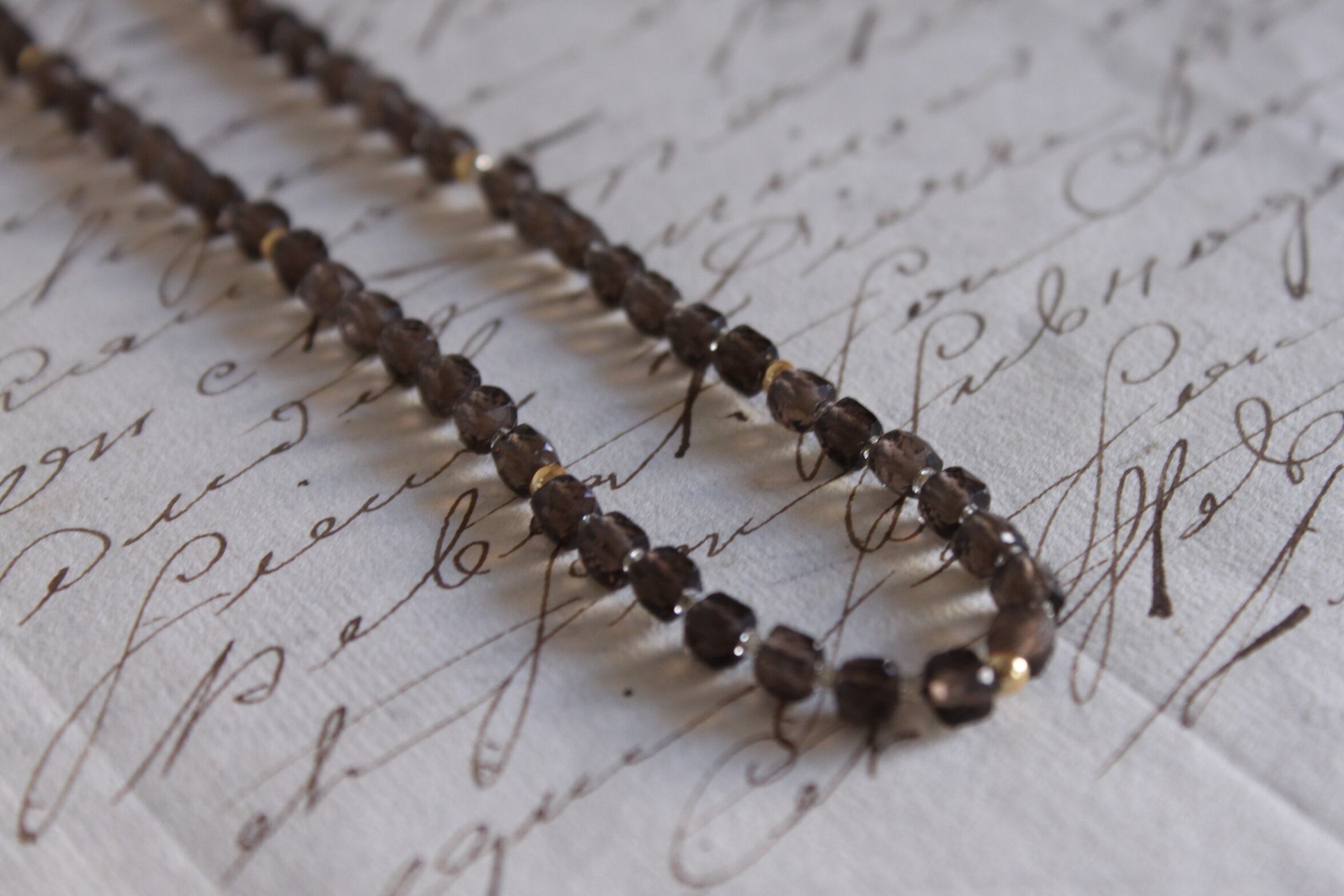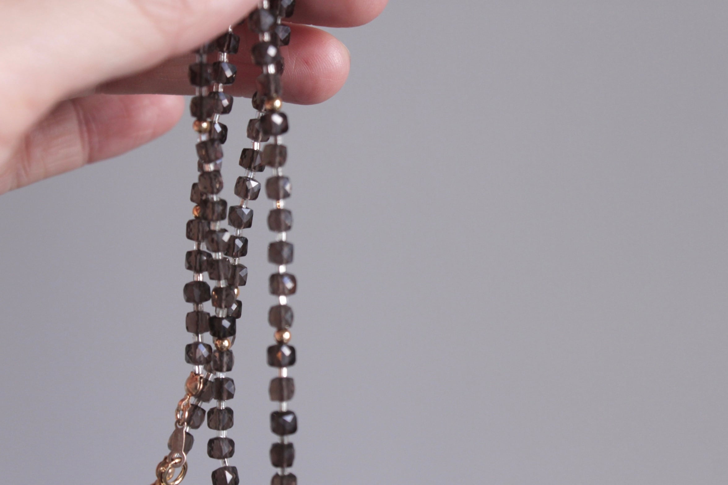 透明感のある、高品質なスモーキークオーツと、ヴィンテージを合わせたネックレス。14kgfのゴールドビーズをアクセントに添わせました。ダークカラーにも関わらず、コーディネートにしっかり馴染む、万能なデザインです。