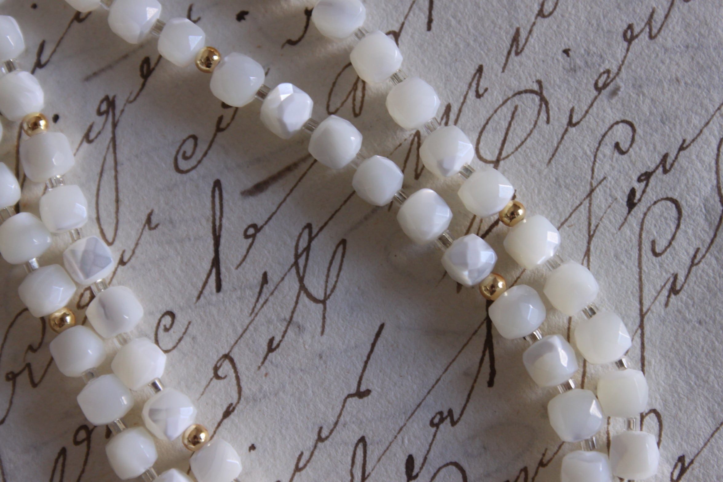 少し角のあるマザーオプパールと、ヴィンテージビーズを組み合わせたネックレス。14kgfのゴールドビーズをアクセントに添わせ、洗練された印象に。光の通し方で表情の変わる、美しいマザーオブパールは、コーディネートに馴染む万能なデザインです。