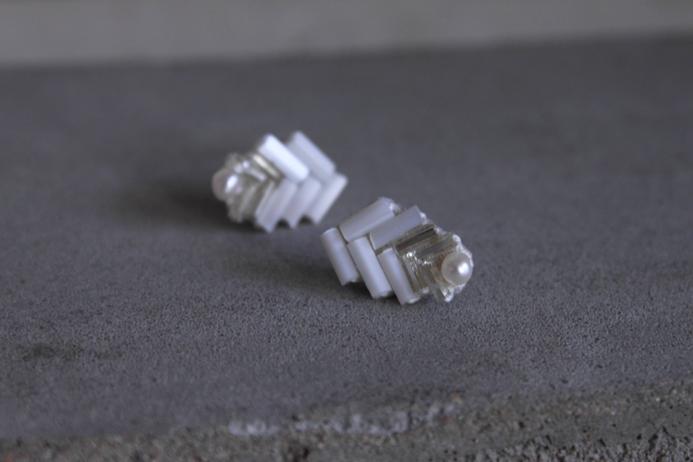 透明感のあるサテンホワイトとシルバーのビーズに、上質なパールを添えて、繊細で上品なイメージに仕立てました。