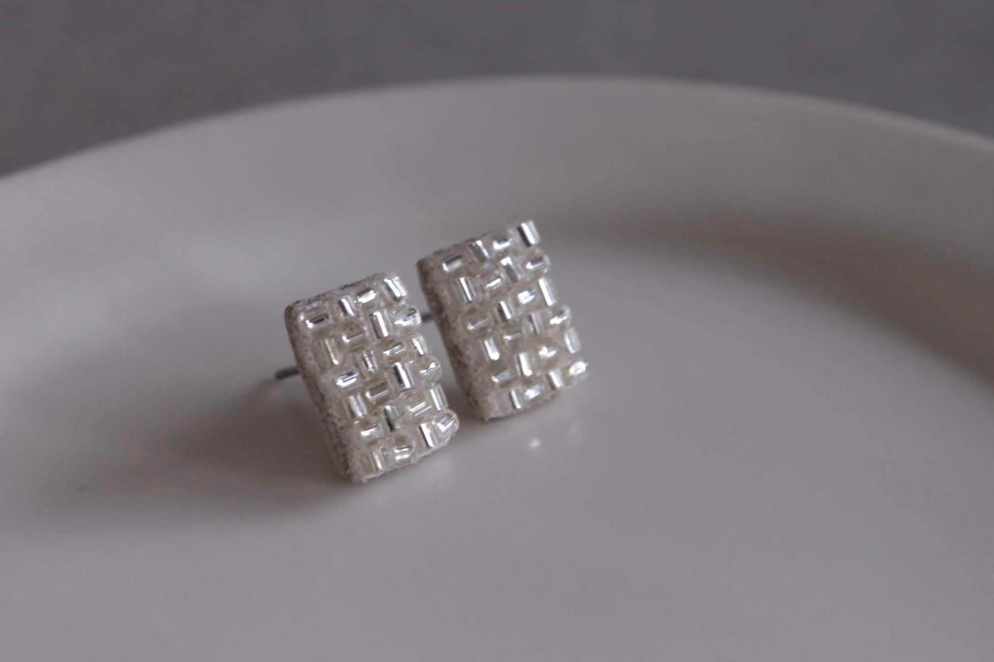 耳元にぴたりと沿う小さなスクエア型のデザイン。